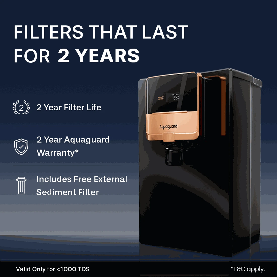 Titanium Duo Filter Technology: Provides long-lasting filtration for up to 2 years or 10,000 litres (for input water TDS <1000), ensuring consistent purification.