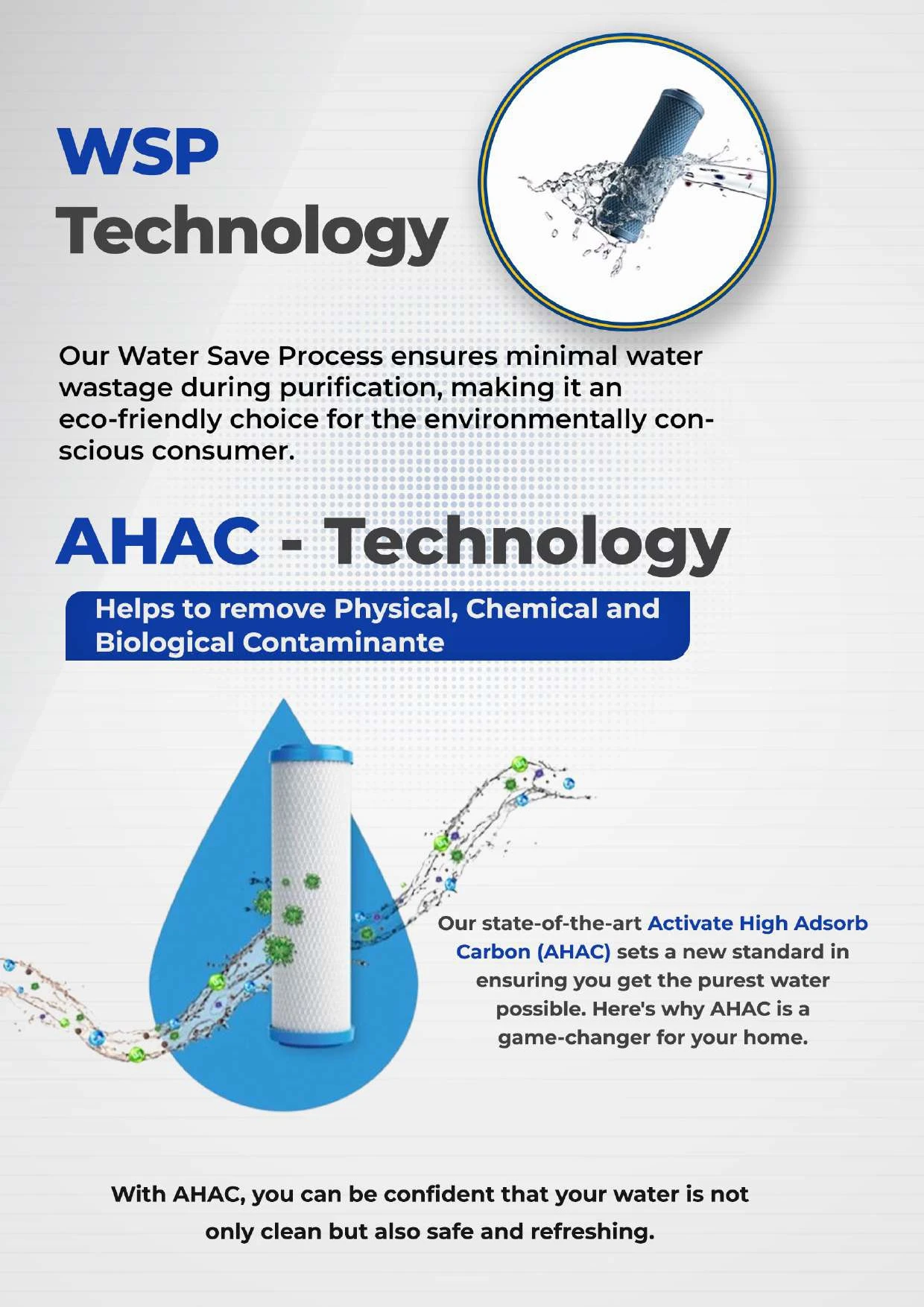 WSP Technology Our Water Save Process ensures minimal water wastage during purification, making it an eco-friendly choice for the environmentally conscious consumer.